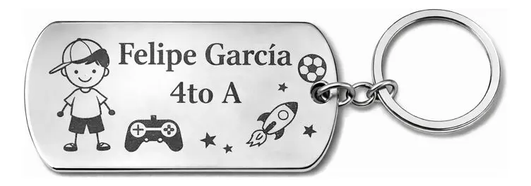 Diseño pensado para niños y niñas, con nombre y grado grabados, además de motivos infantiles que la hacen única y fácil de identificar. Ideal para: – Mochilas escolares – Cartucheras – Bolsos de actividades – Loncheras – Útiles personales