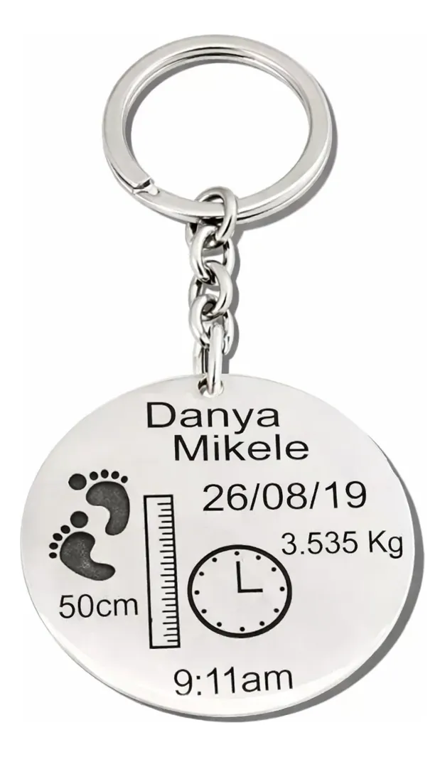 Este llavero circular está pensado para grabar los datos más especiales de un nacimiento o fecha significativa, creando una pieza totalmente personalizada y con gran valor emocional.